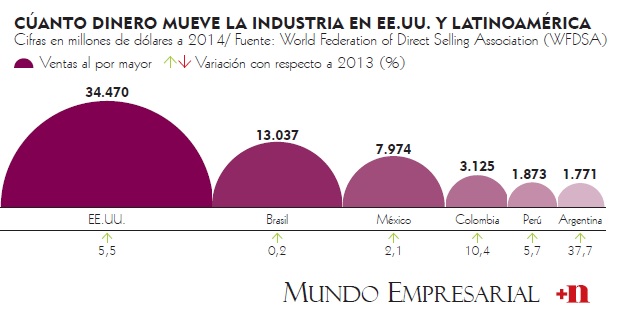 La industria tuvo un crecimiento en el país de 10,4% y 1,5 millones de personas reciben ingresos bajo esta modalidad. Además, aunque el mercado nacional obtuvo un mayor crecimiento, Colombia se encuentra en tercer lugar de los países de Latinoamérica que más ventas genera, por debajo de Brasil y México, (ver gráfico).